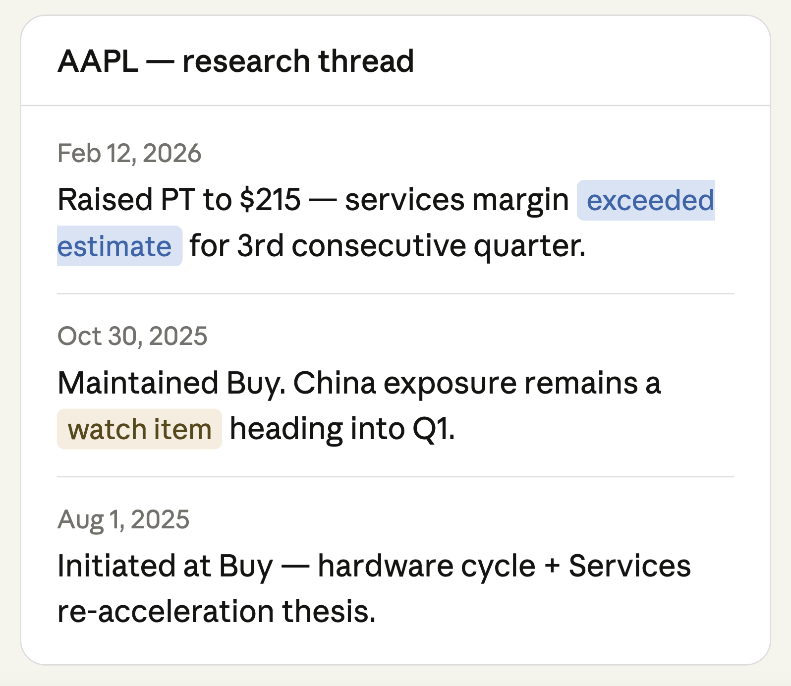 Strēm preserves the reasoning behind every position. When a new analyst covers a name, or an IC meeting is approaching, the context is already there.