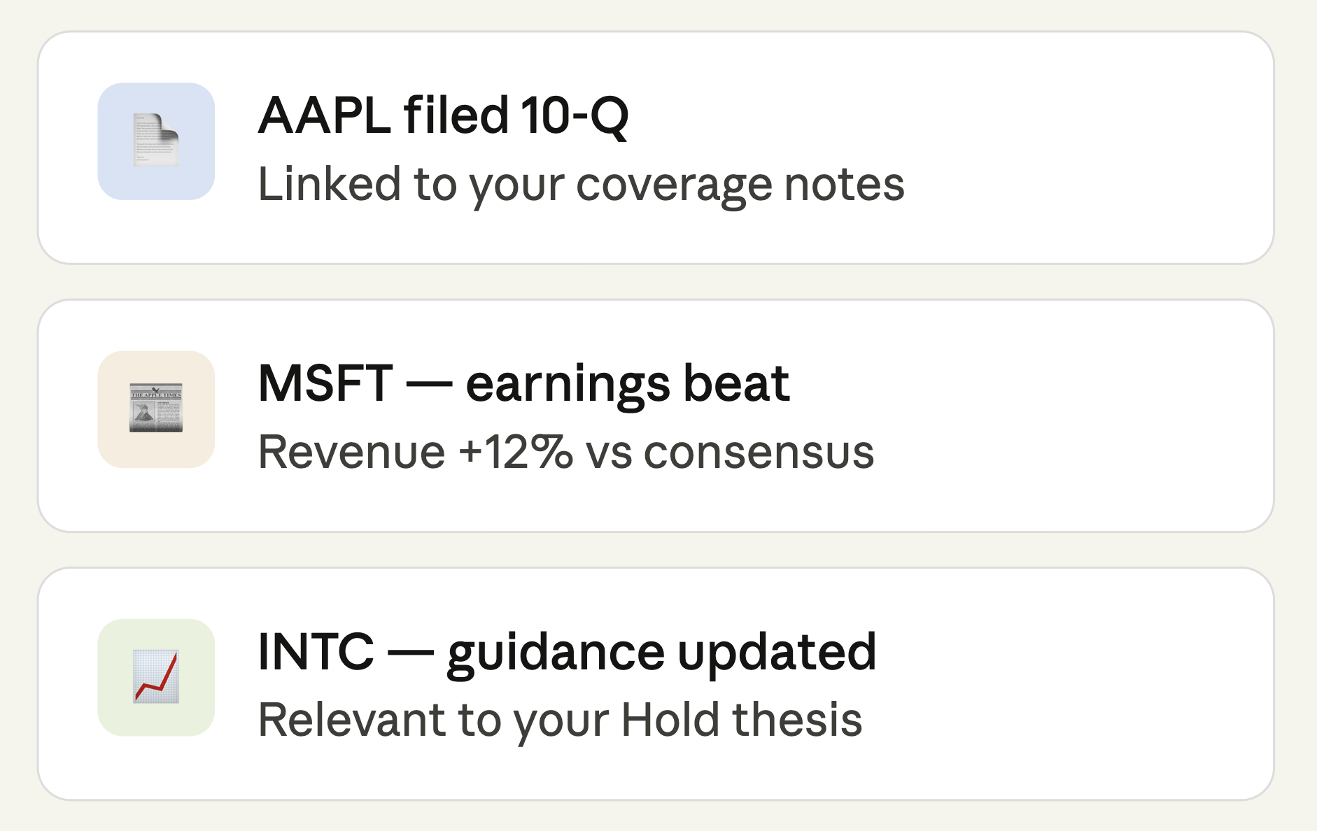Alerts connect directly to your coverage and watchlists. When something changes — a filing drops, news breaks — you see it in context, not in a vacuum.